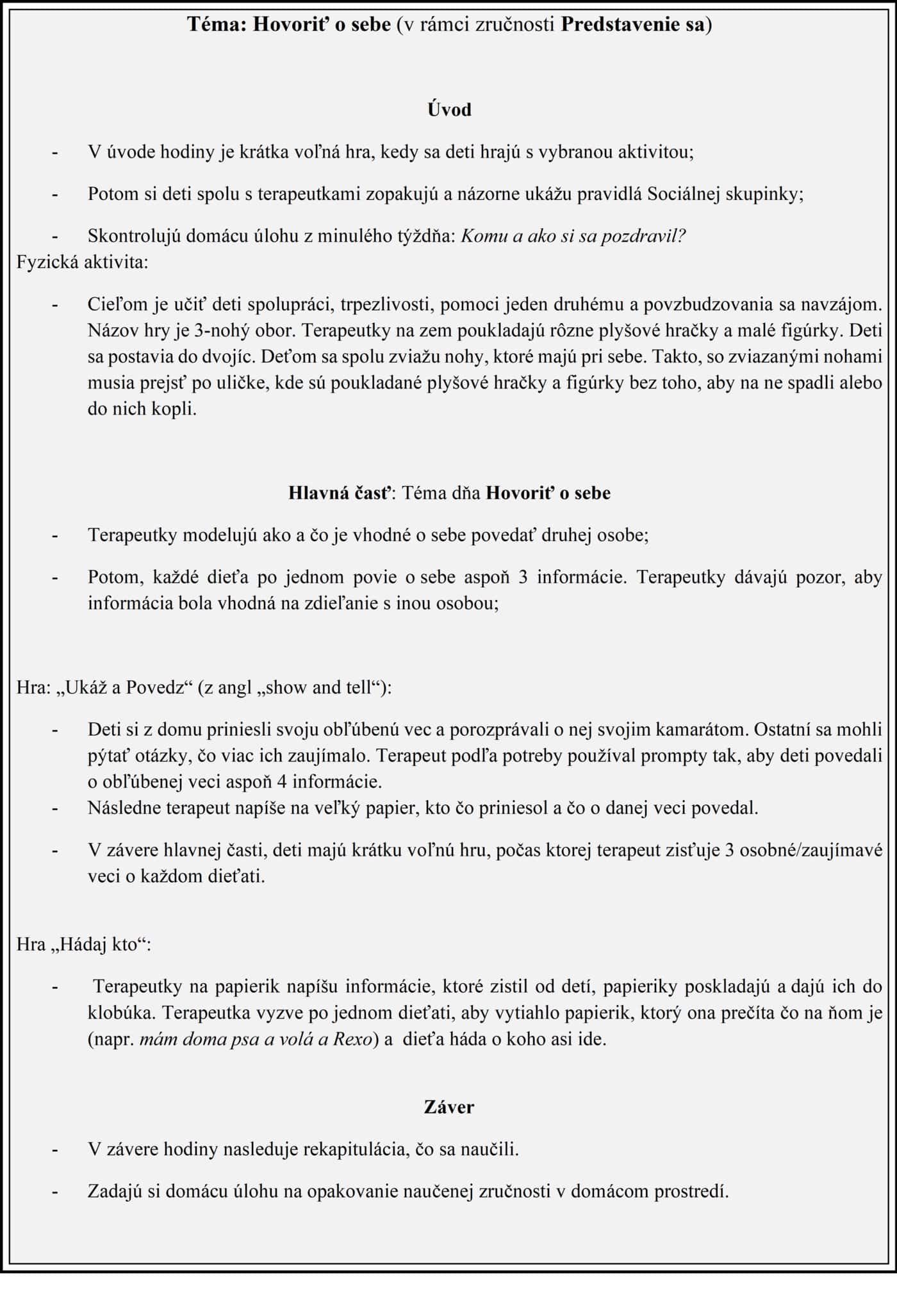 Počas úvodného stretnutia sme realizovali hodnotenie sociálneho správania v spomínaných oblastiach pomocou pozorovacieho dotazníka, do ktorého terapeutky zapísali aktuálnu úroveň jednotlivých zručností. Toto hodnotenie sa zopakuje o pol roka, aby sa zhodnotil progres naučených zručností u každého dieťaťa. Aktuálne prebiehajú sociálne skupinky, kde priebeh je realizovaný hravou a nenásilnou formou. Cieľ je, aby deti mali zábavu pričom sa učili ako sa navzájom hrať, spolu komunikovať a hlavne prejavovať záujem jeden o druhého.