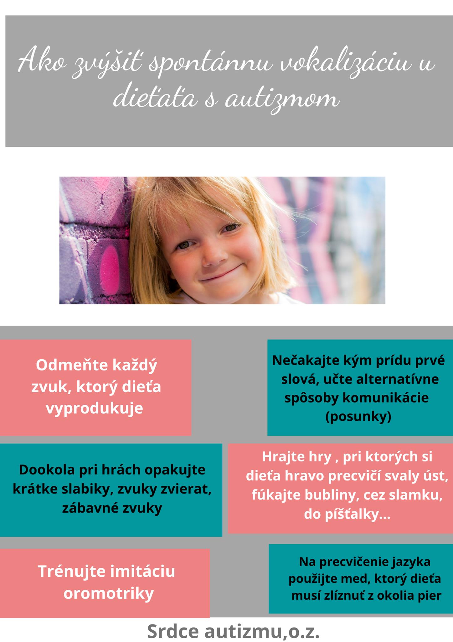 Skôr než sa dieťa naučí používať funkčnú vokálnu komunikáciu, cielene sa dennodenne musíte zameriavať na rozvoj spontánnych vokalizácii, ktoré neskôr preklopíte do vokálnej imitácie a ďalších verbálnych operantov, nevyhnutých pre rozvíjanie reči. Ak máte pocit, že Vaše dieťa málo vokalizuje, môžete skúsiť niektoré z nasledujúcich tipov.